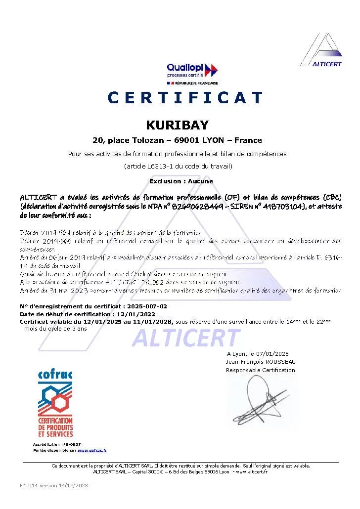 Véritable témoignage de notre engagement en faveur de la qualité, KURIBAY a obtenu la certification QUALIOPI pour ses prestations de formation et bilans de compétences.
